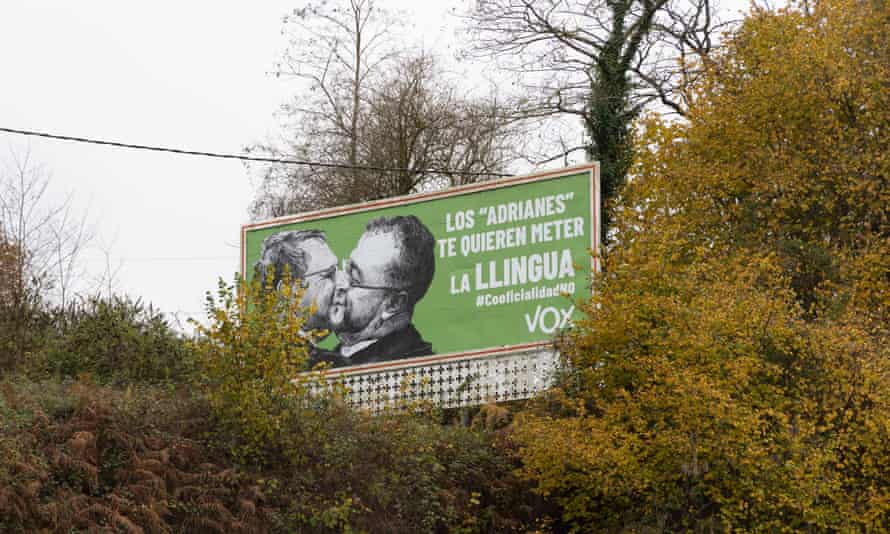 En cambio, los otros idiomas cooficiales de España son invisibles fuera de sus regiones y se enfrentan a un nacionalismo español de una nación cada vez más ruidoso liderado por un neofascismo resurgente que no se vio al final de la dictadura en 1975. El partido de extrema derecha Vox, opuesta con vehemencia a las lenguas minoritarias, ha producido una campaña publicitaria que muestra al presidente asturiano besando a un activista lingüístico bajo el lema: «Te están intentando meter la lengua».
